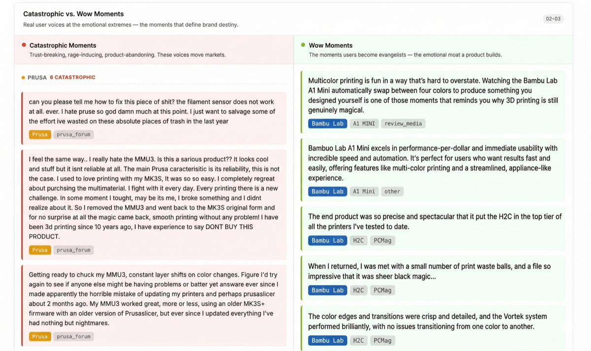 This is where sentiment volume misleads you. The relevant metric isn't how often users complain. It's how hard they collapse when they do. I call this emotional intensity: the degree to which a failure ruptures the user's relationship with the product. On that dimension, Bambu's Collapse Count was 0. Not a single user described a desire to destroy the machine.