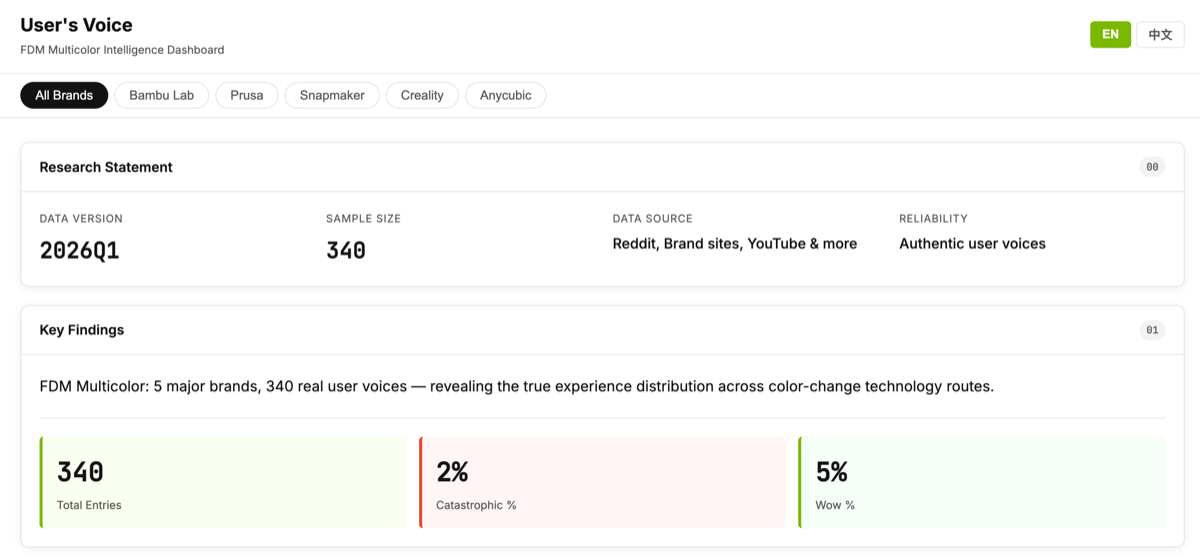 Note on Data: This analysis is based on 340 user comments from the Reddit r/3Dprinting community as of March 2026. Samples include Bambu Lab, Prusa, Snapmaker, Creality, and Anycubic.