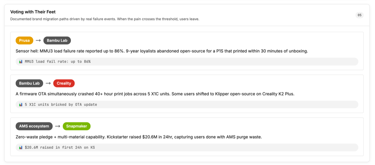 Prusa was the spiritual totem of open-source 3D printing. In 2012, Josef Prusa designed the i3 in a Prague apartment with zero VC funding. He moved hundreds of thousands of units purely on community momentum. But sentiment doesn't stop history. My attribution analysis shows 20% of Prusa users are "Brand Believers." They pay for the ideology. They tolerate defects because they feel like co-creators, not just customers.