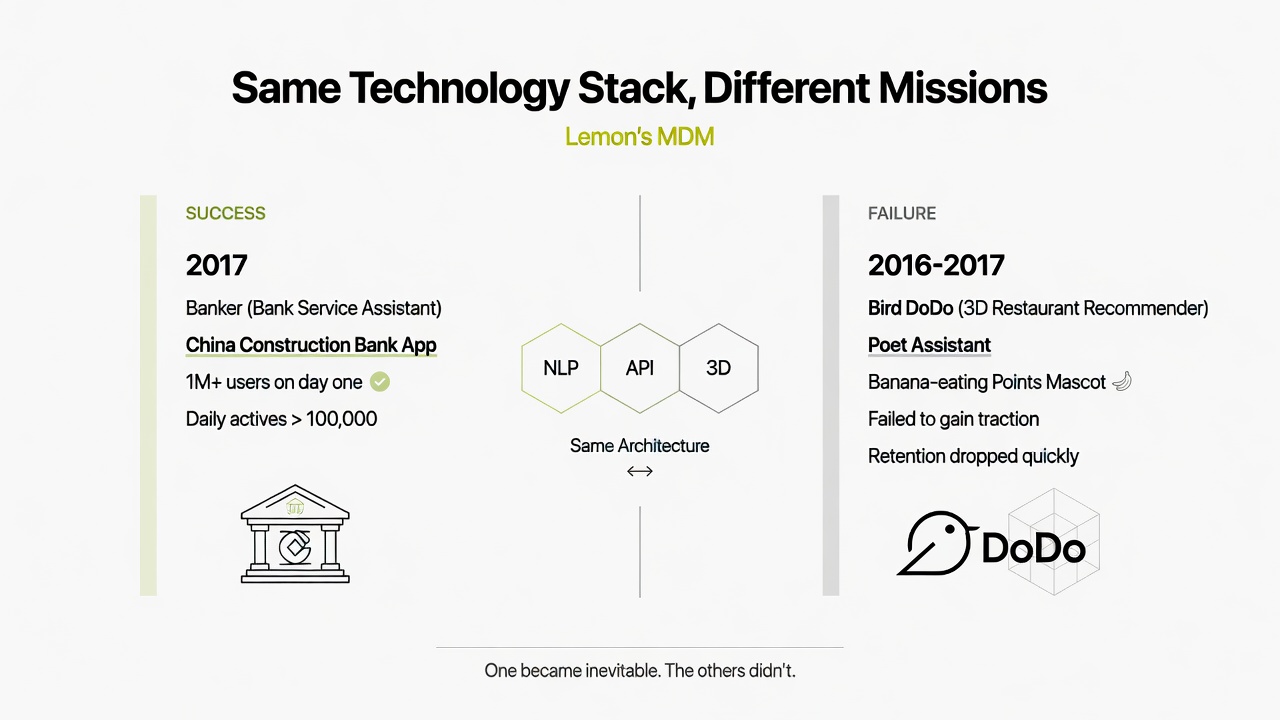 In 2017, a bank service assistant called Banker launched inside China Construction Bank's app and hit over one million users on day one, with daily actives staying above 100,000. (Internal data, CCB app launch, 2017.)