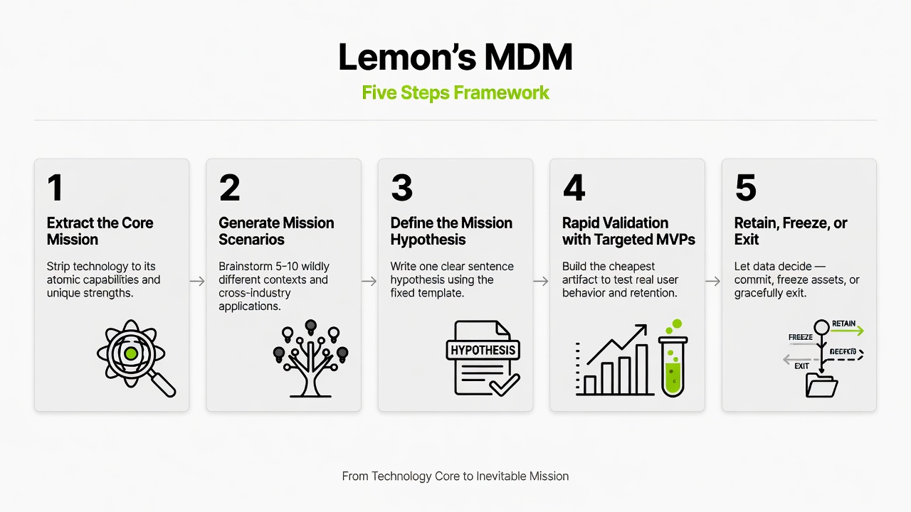 Lemon's MDM is a first-principles framework that starts from the technology's core capabilities, systematically explores multiple mission-aligned scenarios, validates them with real behavior data, and forces clear retain / freeze / exit decisions.