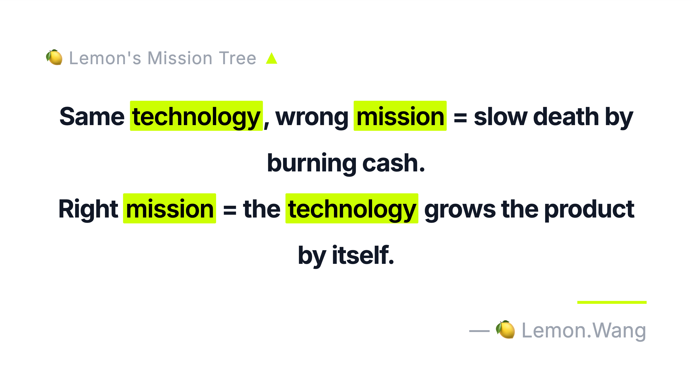 Same technology, wrong mission = slow death by burning cash. Right mission = the technology grows the product by itself.